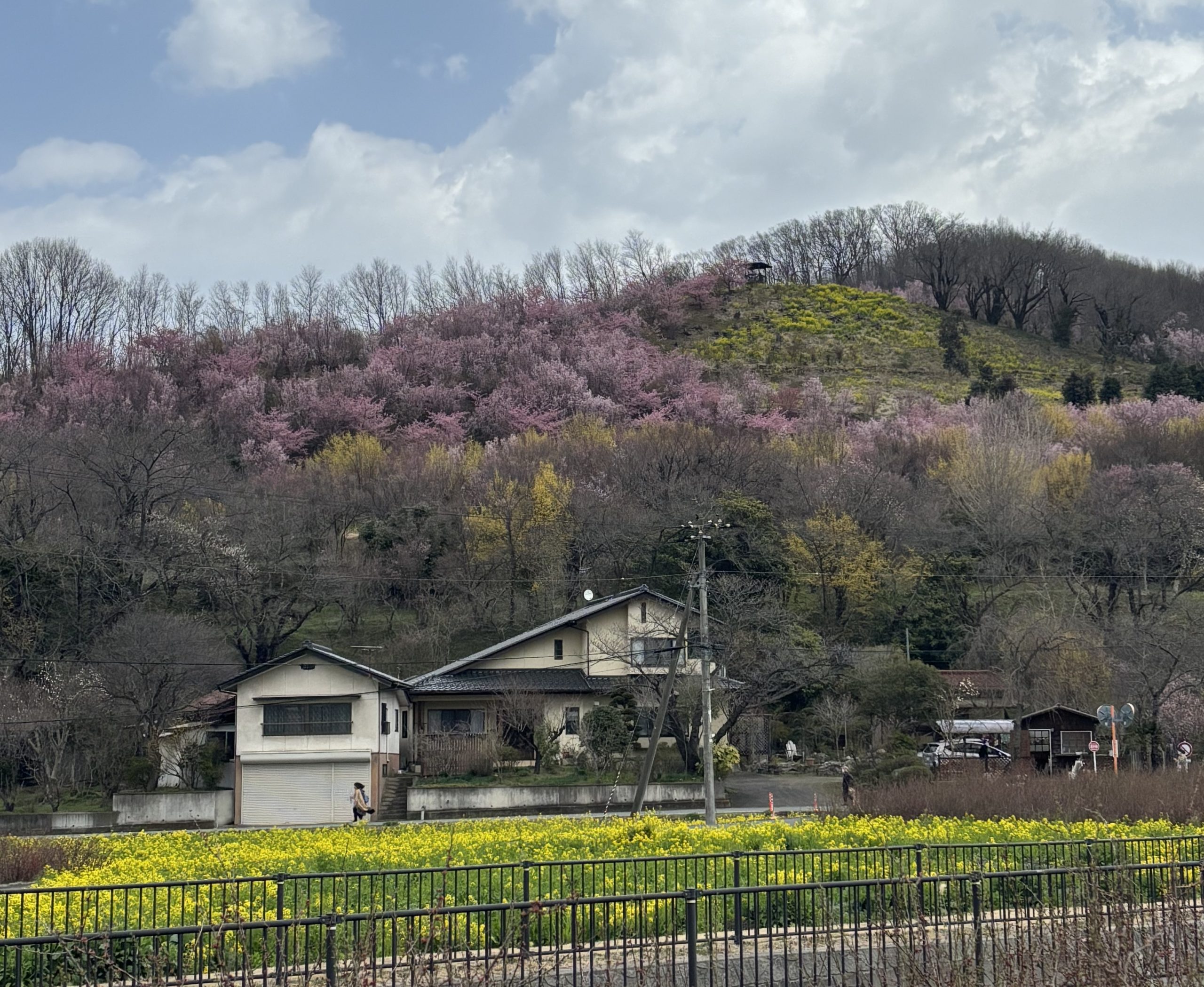 菜の花やサンシュユの黄色、早咲きの桜のピンク色と春を告げる色とりどりの花と
