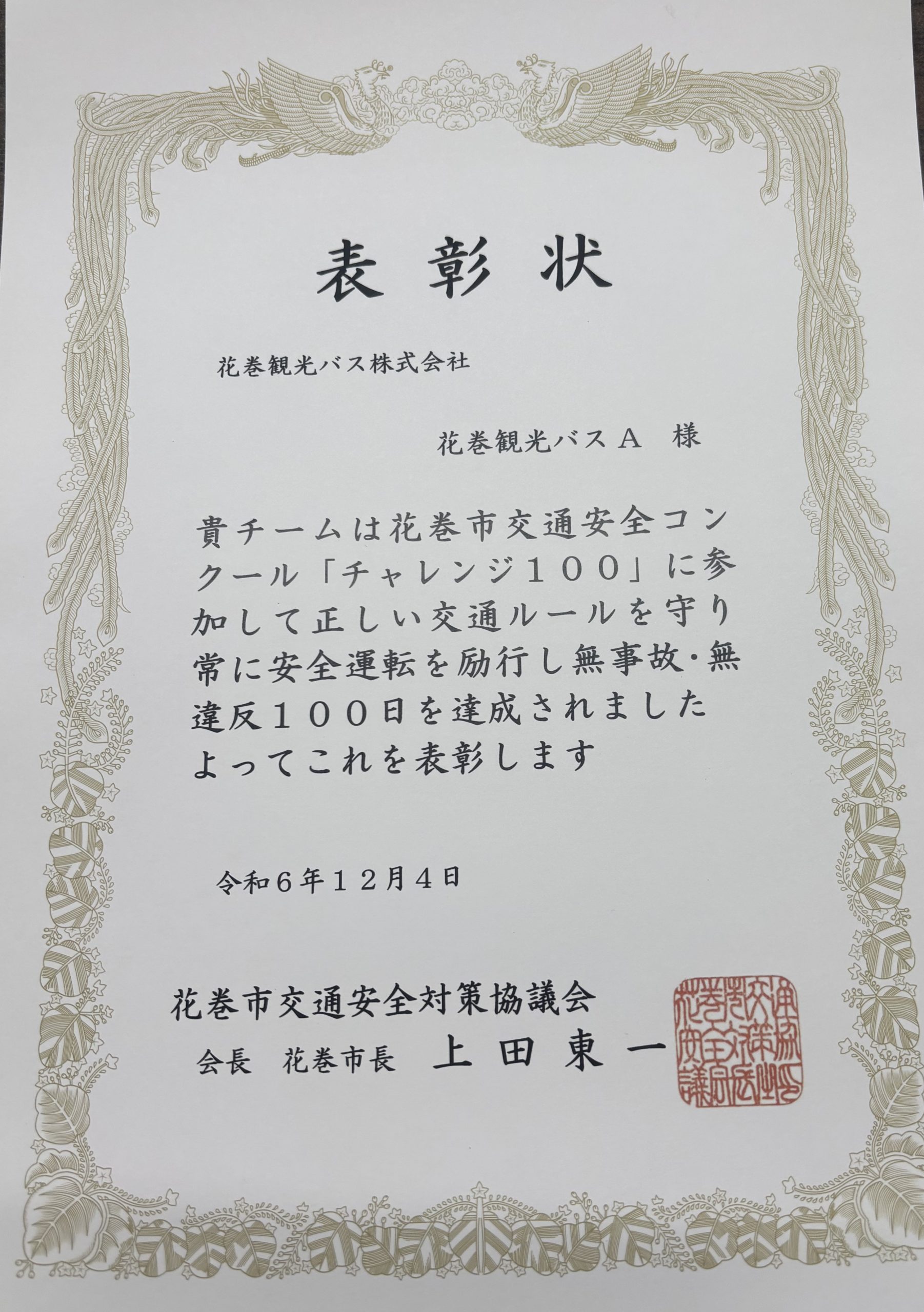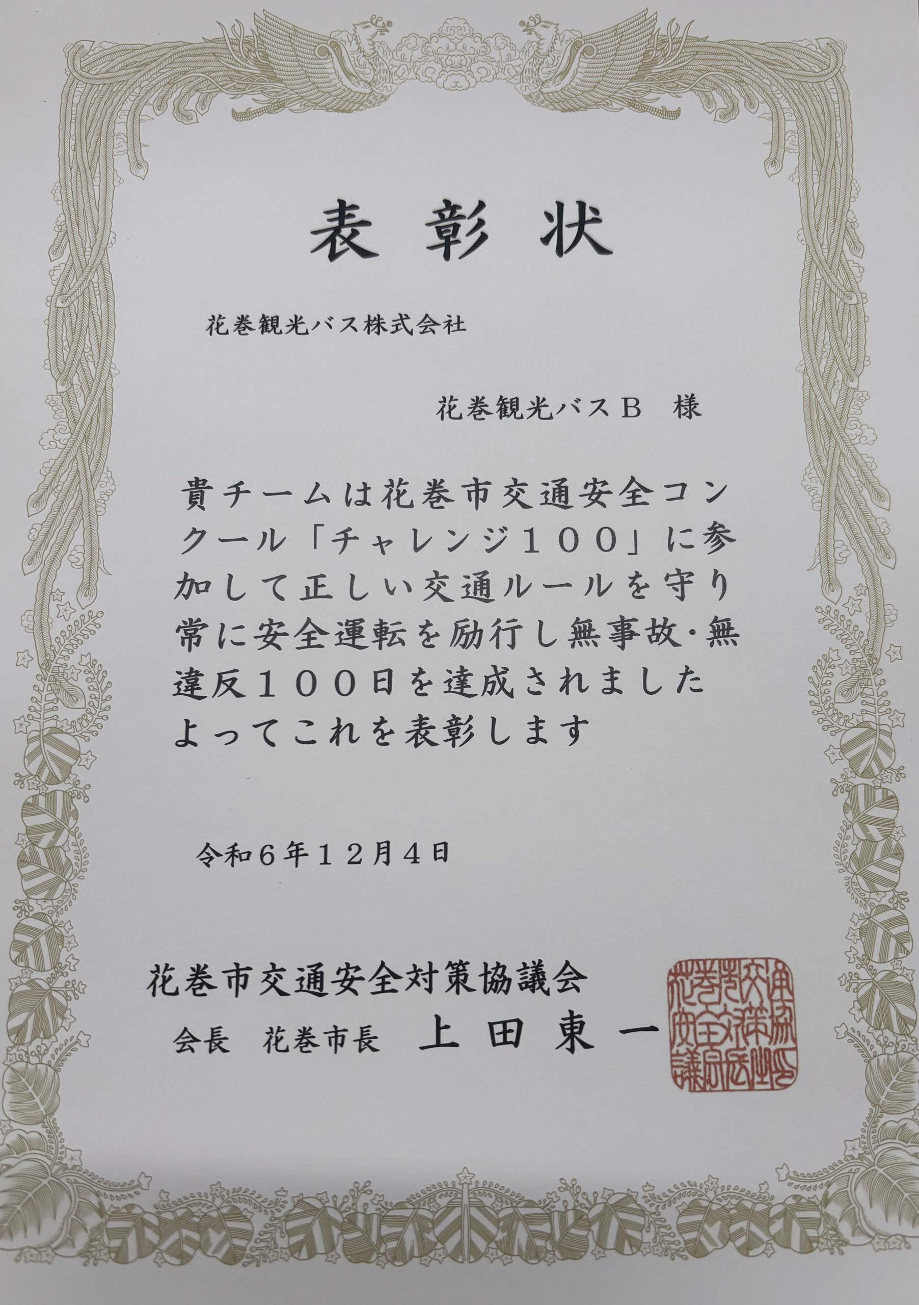 毎年弊社では、花巻市交通安全コンクール「チャレンジ100」に参加しています。