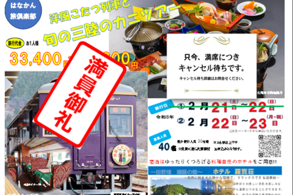 2025年11月11日 【はなかん旅倶楽部】 洋風こたつ列車と旬の三陸カニツアー 2/21(土)~22(日) ご旅行日 2026年02月21日 ご旅行代金 33,400円~35,600円(税込) 詳細を見る