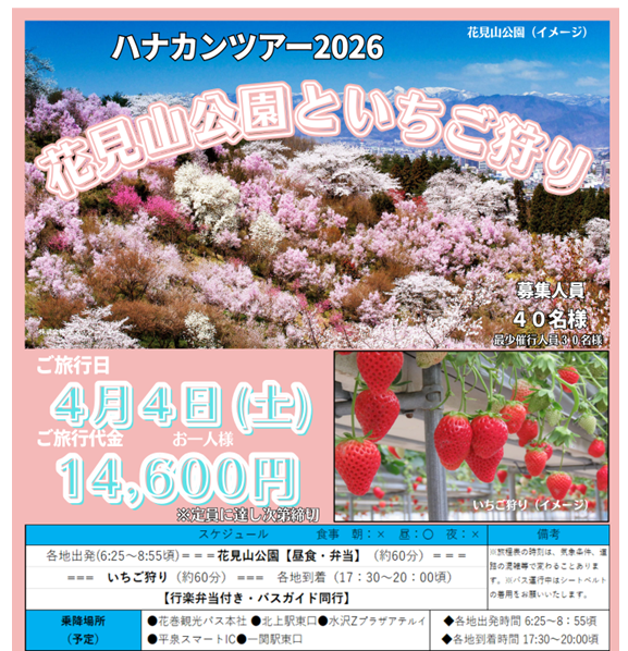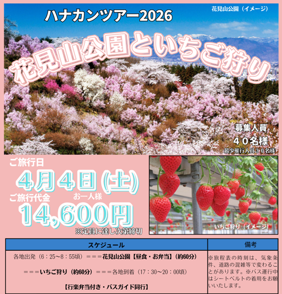 春の訪れを全身で感じる、季節限定の日帰りバスツアーをご用意しました。 福島を代表する花の名所「花見山公園」で、色とりどりに咲き誇る花々を楽しんだあとは、人気の「和田観光いちご園」で甘くてみずみずしいいちご狩りを満喫できます。
